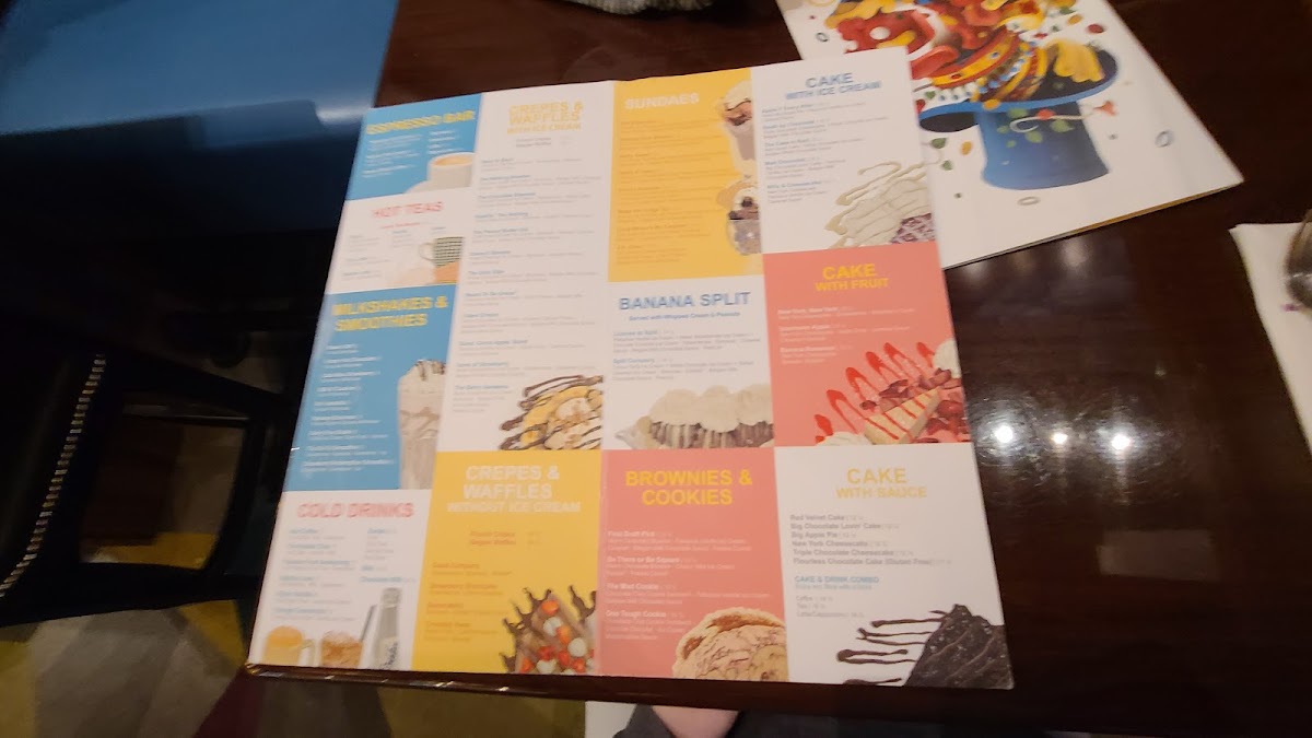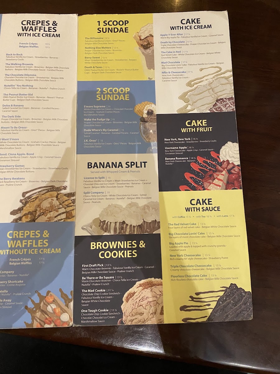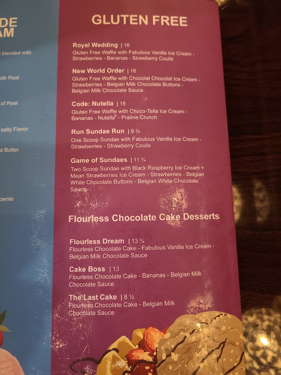 Your choice of Waffle or Crepe with Vanilla ice-cream, brownies, Belgian milk chocolate buttons, Belgian milk chocolate sauce and pecans (Ice-cream for this dessert is served on the side)