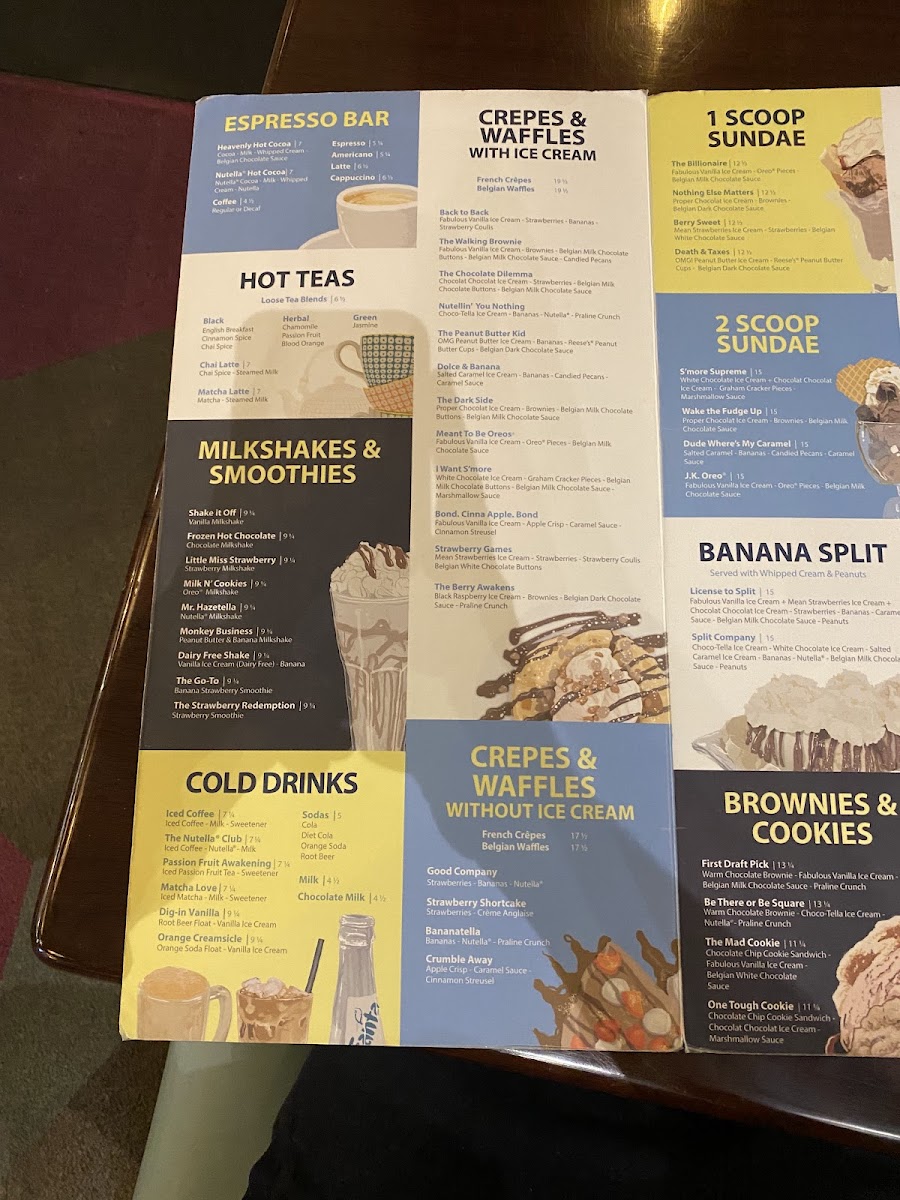 Your choice of Waffle or Crepe with Peanut Butter ice-cream, bananas, Belgian dark chocolate sauce, and Reese's peanut butter cups (Ice-cream for this dessert is served on the side)