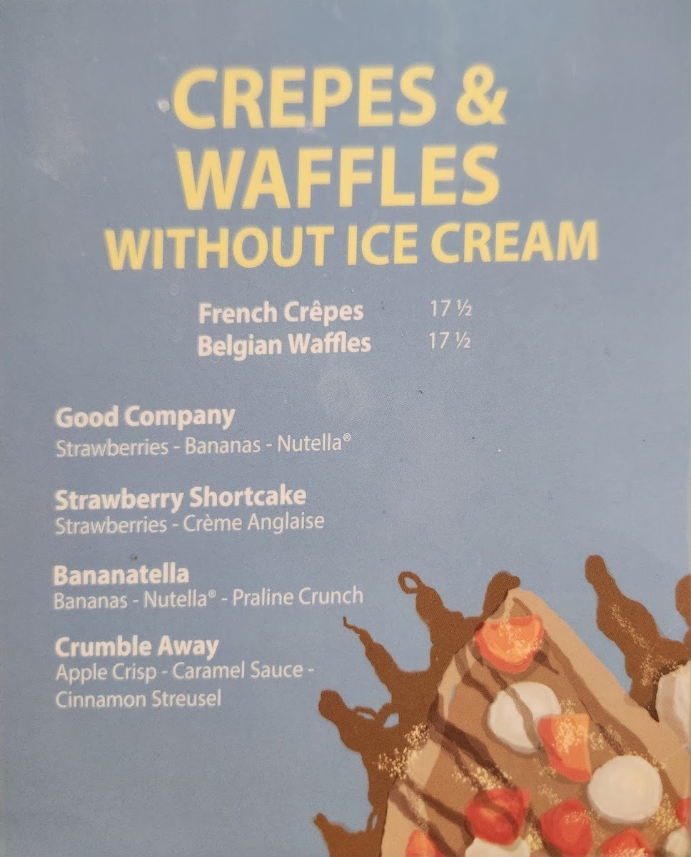 Your choice of Waffle or Crepe with White Chocolate ice-cream, Belgian milk chocolate sauce, marshmallow sauce, graham cracker pieces, Belgian milk chocolate buttons (Ice-cream for this dessert is served on the side)